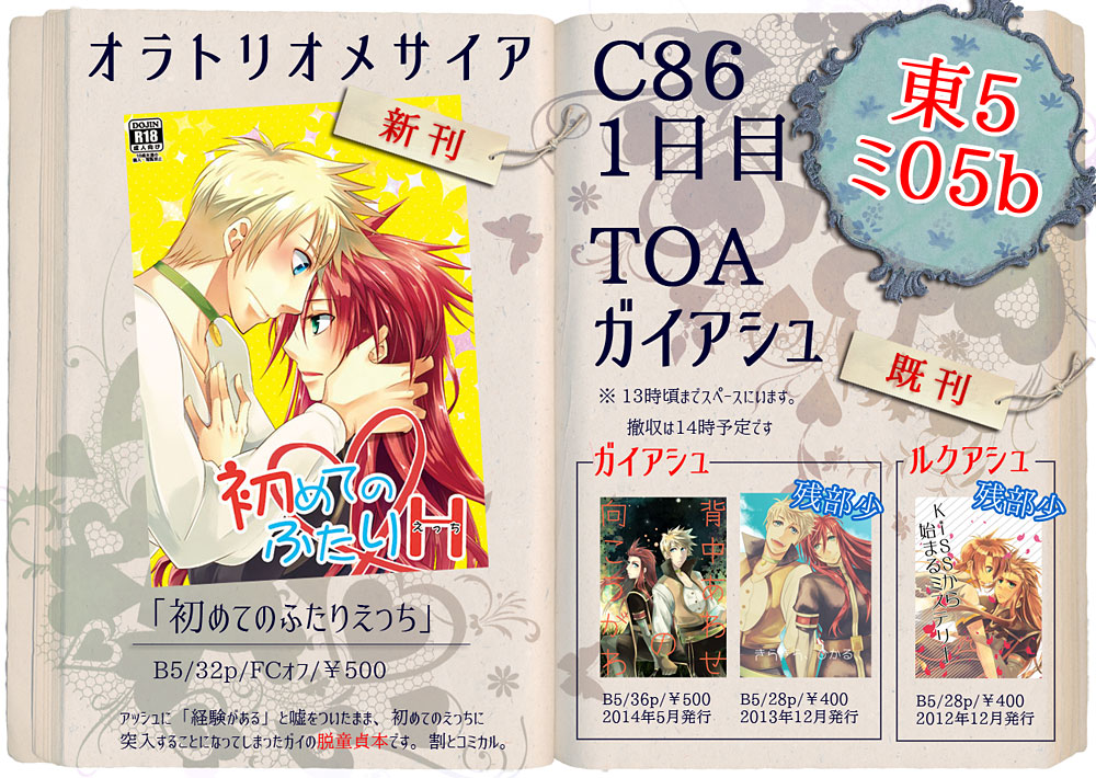 2014年8月15日(金) Comic Market 67 1日目 東地区 ミ05b「オラトリオメサイア」(TOA/ガイアシュ)で参加します。