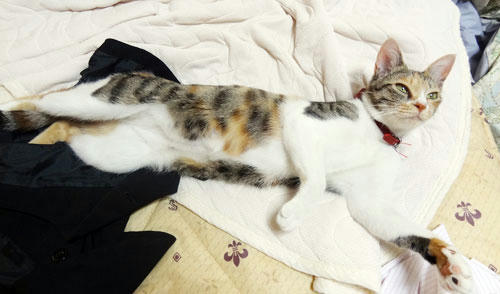 なお、ココちゃんは同様に手術したのに包帯ぐるぐる巻ではなく、ガーゼを絆創膏しただけで帰ってきたうえに、自分で糸を舐め取ってしまって術後処置不要にしてしまいました。