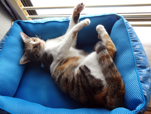 ココちゃんの夏用ベッド。出窓でのびのびーん。ココは手足が長いです。すらりんちょ。