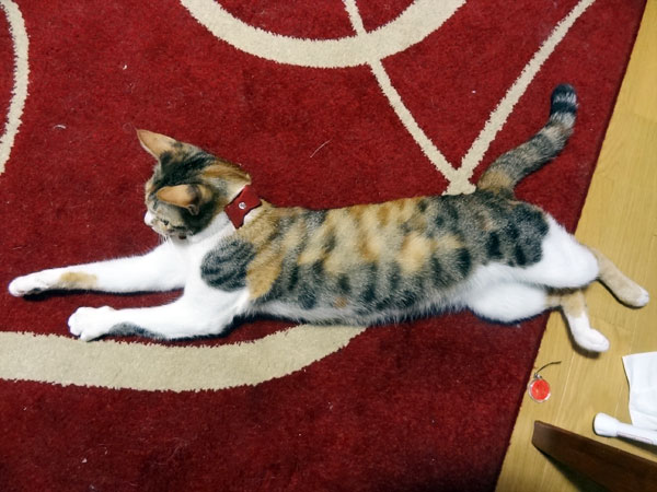 のびのびーんココちゃん。それにしても三毛猫に赤色ってなんであんなに似合うんでしょう。